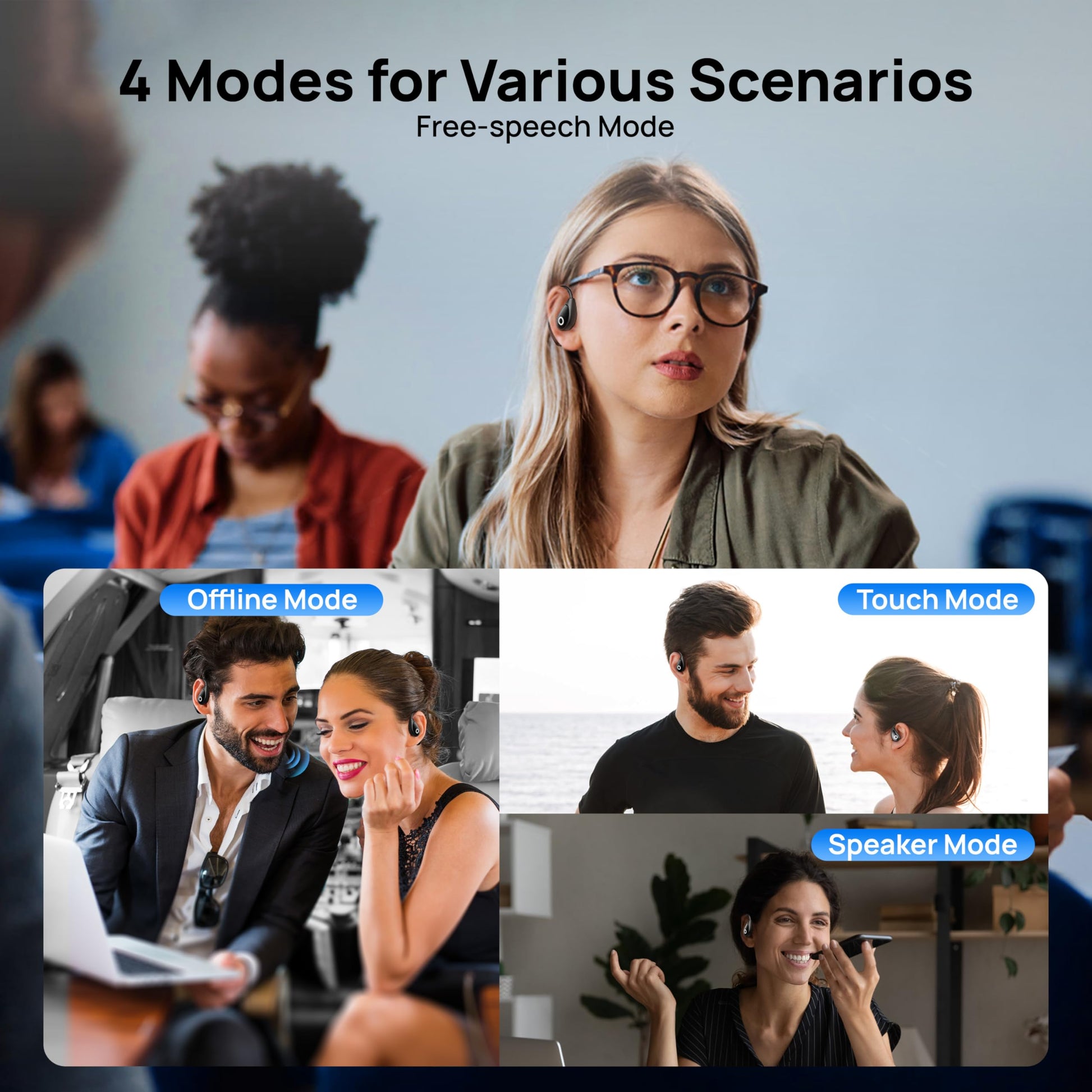 Binaural Mode: One person wears one earbud and speaks into it, while the translation is played through the earbuds.
